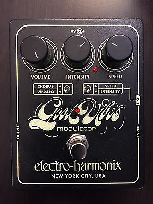 This pedal is awesome. The Good Vibes recaptures the iconic chorus/vibrato effect of the 1960s in an updated pedal with features designed to meet the needs of the modern player. Like the original Uni-Vibe®, it uses photocells to create chorus and vibrato with a warm, undulating, liquid groove for a sound and response that’s true to the classic design. Boosted power rails provide 21st century definition and headroom, and an expression pedal input puts free-form control for speed or intensity at your feet. True bypass, too. Very groovy! – Selectable Chorus or Vibrato delivers classic 1960’s tone and vibe – Simple control set: Volume, Intensity, Speed – Expression pedal control of Speed or Intensity – Boosted power rails for extended headroom and definition – Always-on Speed indicator – Rugged and compact die-cast chassis – True Bypass – EHX 9.6DC power supply included North Shore Music Institute has served the Chicagoland area since 2002. We only sell items that we believe in!