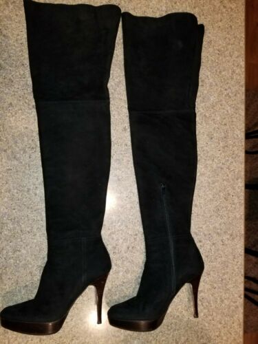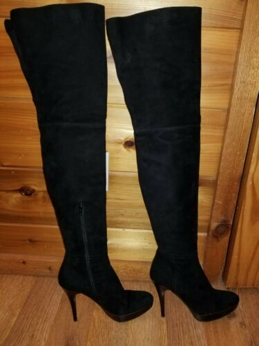 STUART WEITZMAN THIGH HIGH SUEDE LEATHER BOOTS 7.5M BLACK NEAR MINT CONDITION . Condition is Like new Pre-owned. Shipped with USPS Priority Mail.leather,silk,leather footbed lining. Soles and heels like new.Flawless leather outside and inside. Minor scuffs on backs of each sole. Totally georgios boots!!! Seriously almost like brand new!! Platform 4.5″ heel 1.25″ platform 10″ zipper 13.5″ calf 18″ top opening 7.5″ rear stretch panel 24.5″ shaft. Near mint boots except for minor heel scuffs. (63)