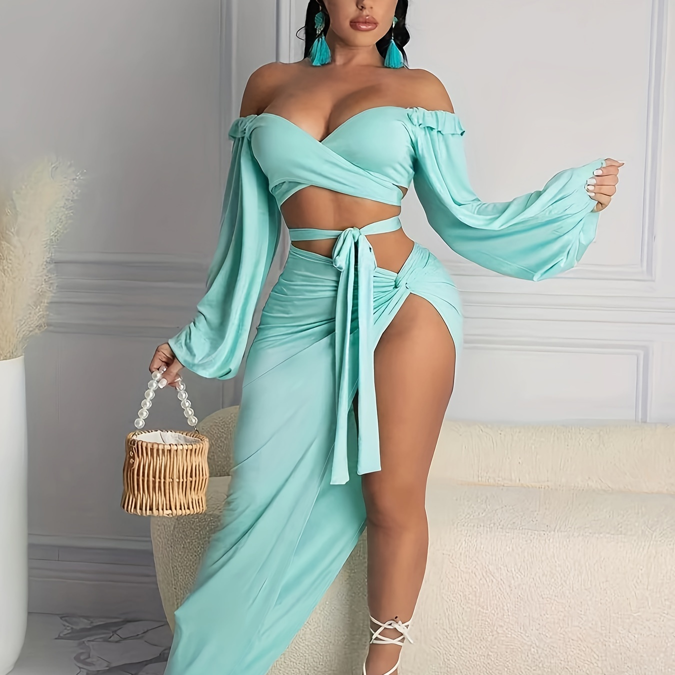 ????️ Sexy Solid Two-piece Skirt Set, Off Shoulder Crop Top & Twist Split Skirt Outfits, Women’s Clothing