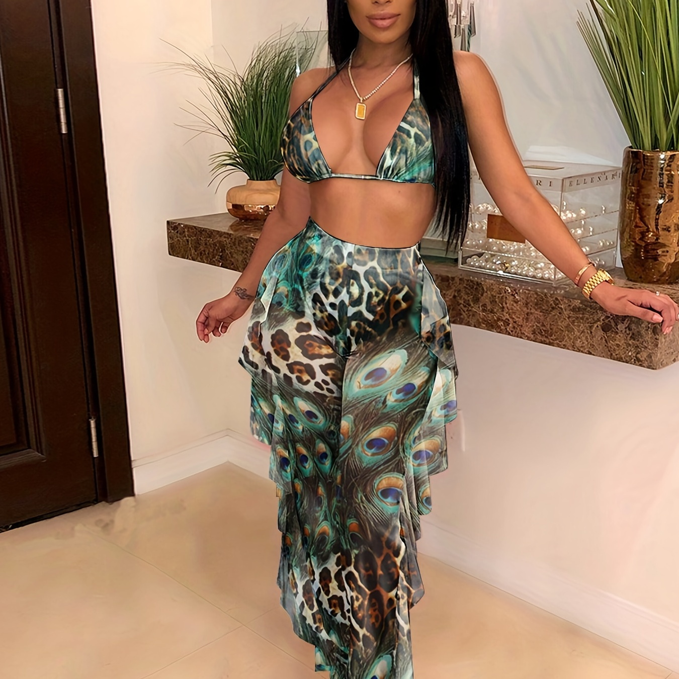 ????️ Leopard & Peacock Print Two-piece Set, Spaghetti Sleeveless Crop Top & High Waist Ruffle Trim Pants Outfits, Women’s Clothing